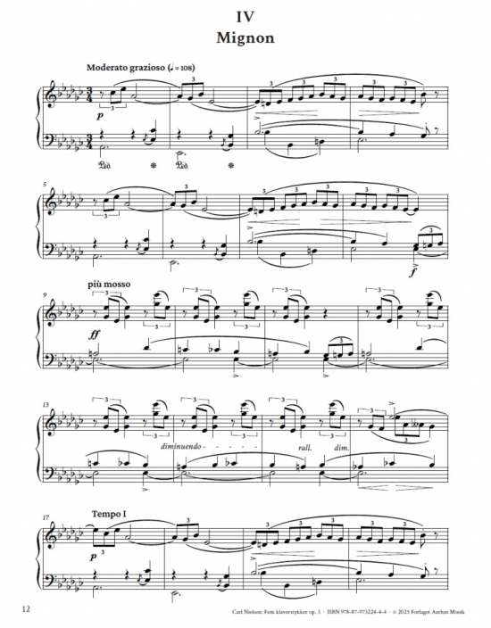 Fem klaverstykker är musik som inte ropar högt. Här etableras den lätta nordiska tonen – med Nielsens karakteristiska lek mellan dur och moll, hans förmåga att vända och vrida det musikaliska materialet, och en enkelhet som ändå rymmer stort djup.