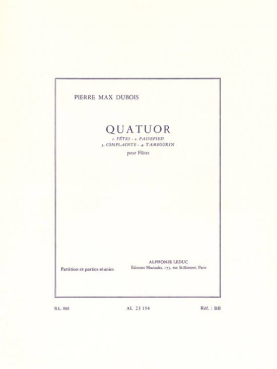Mycket av den musik som finns för flöjtkvartett är arrangerad men här ett ett originalverk. Kanske är det en av anledningarna till att Pierre Max Dubois – Quatuor pour flûtes är så uppskattad.
