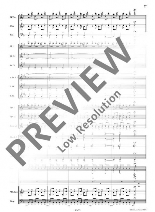 Picc. · Fl. · Ob. · 3 Klar. in B · Bassklar. · 2 Altsax. · 2 Tenorsax. · Baritonsax. - 3 Trp. in B · 2 Hr. · 2 Pos. · 2 Bar. · Tb. - P.S. (I: gr. Tr. · kl. Tr. - II: gr. Beck. · Tamt. - III: Xyl. · Mar. · Chimes)