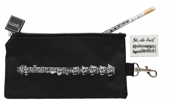Pennfack med dragkedja och karbinhake. Svart bomullstyg med tryckt vit notlinje och svart dragkedja.