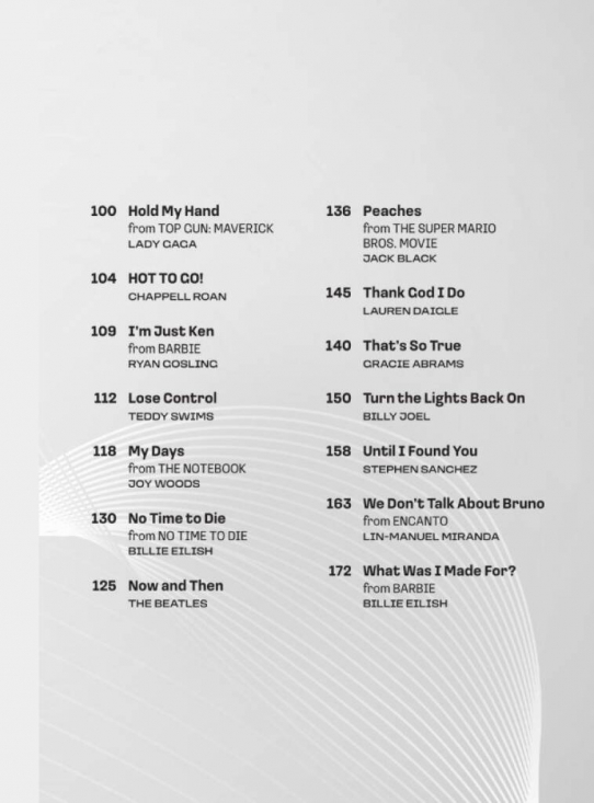 Här hittar du bland annat APT. (Rosé & Bruno Mars), Birds of a Feather (Billie Eilish), Die with a Smile (Lady Gaga & Bruno Mars), Espresso (Sabrina Carpenter), Fortnight (Taylor Swift), Good Luck, Babe! (Chappell Roan) och That's So True (Gracie Abrams). En lättillgänglig notbok som gör det enkelt och roligt att spela 2020-talets största hits hemma, med vänner eller på små framträdanden.