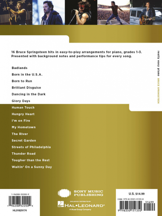 16 av Bruce Springsteens hits i enkla arrangemang för piano. Noter, text och ackordbeteckningar.