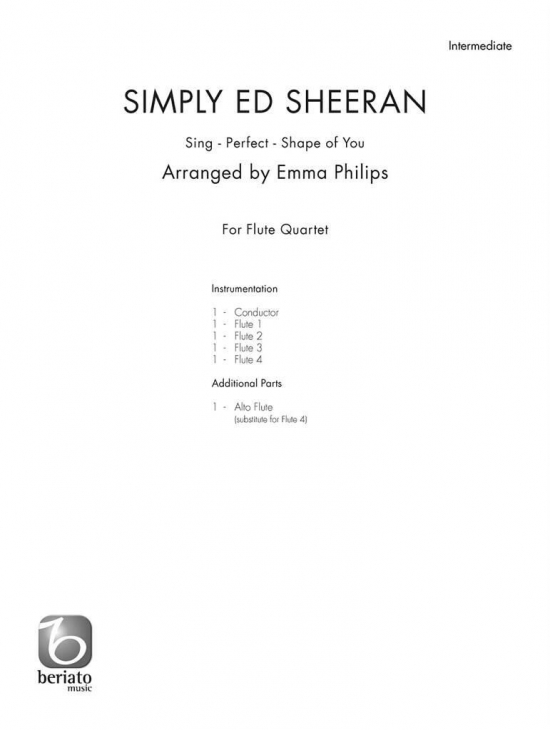 Tre av Ed Sheerans största låtar i ett lättspelat arrangemang för kvartett av Emma Philips. Här möts popkänsla och spelglädje i arrangemang av Sing, Perfect och Shape of You – perfekt för ensemble, konserter och undervisning.
