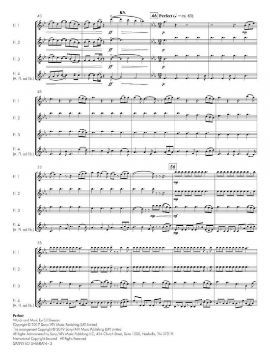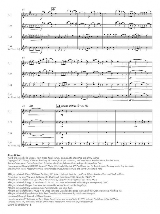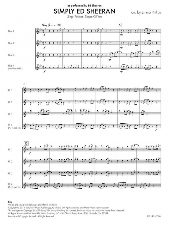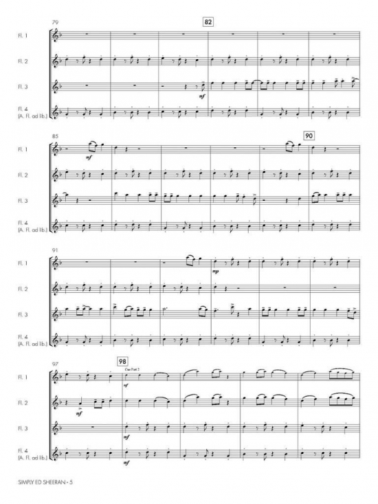 Tre Ed Sheeran-hits för flöjtkvartett. C-flöjter, med extrastämma för altflöjt i stämma 4.